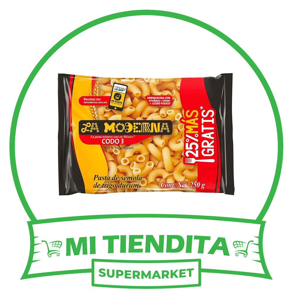 La sopa La Moderna Codo No.3 en presentación de 250 g es ideal para preparar comidas reconfortantes y nutritivas. Es fácil de cocinar y se puede disfrutar sola o como acompañante de otros platillos. Su forma codo es conocida por captar salsas y sabores, c